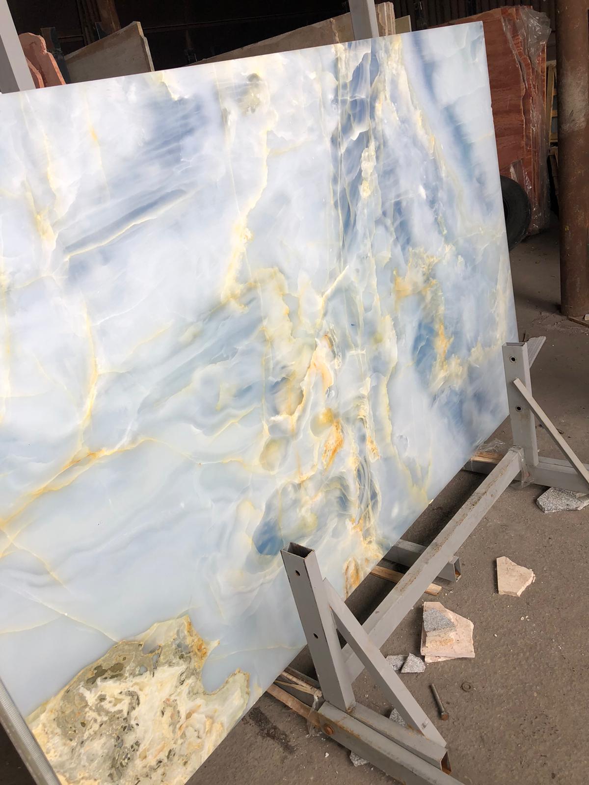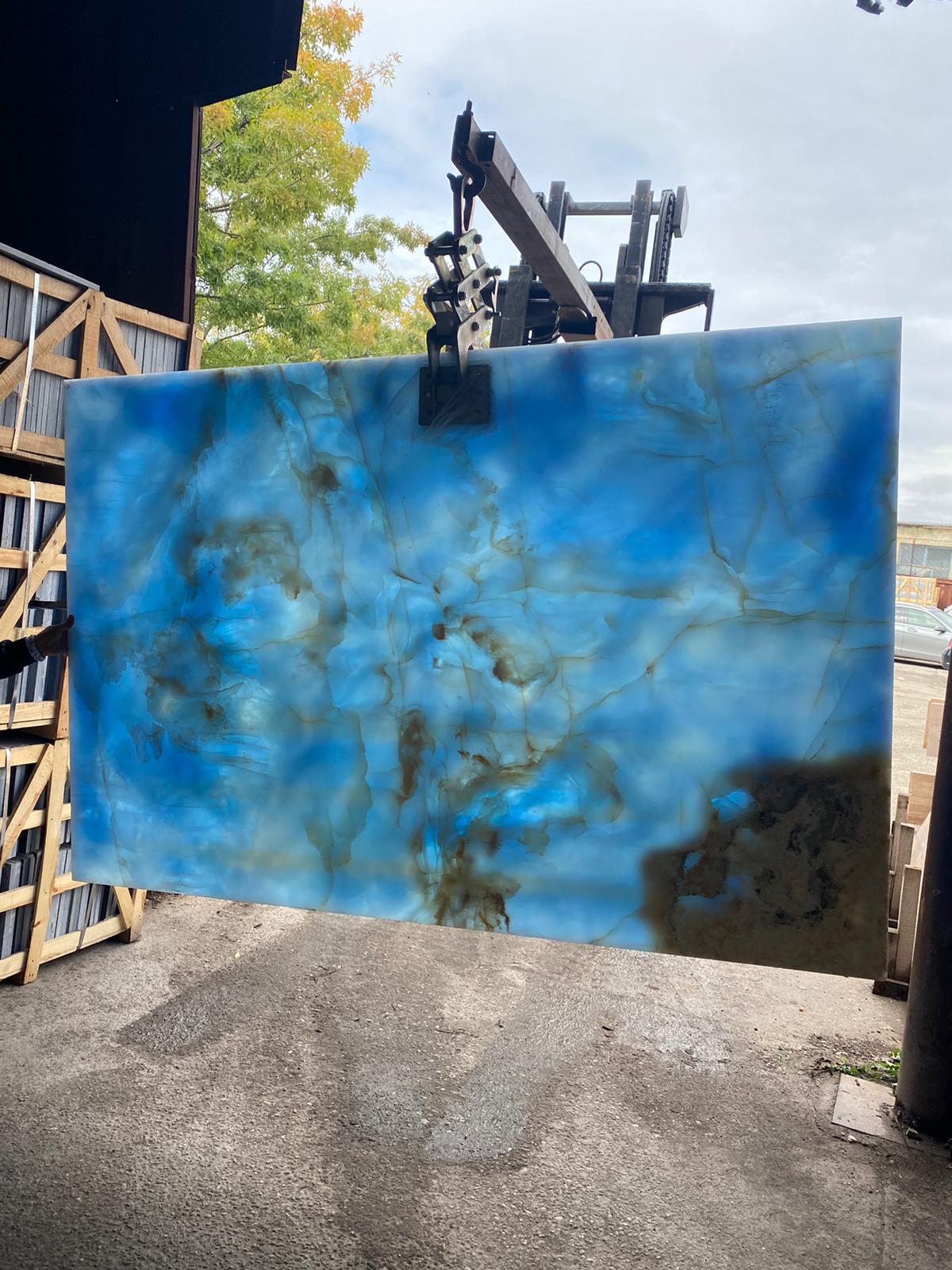 Onixul albastru (Onix Blue lagoon) este o piatră semiprețioasă renumită pentru frumusețea sa și aspectul său captivant. Acest onix contine varietăți de albastru, de la nuanțe deschise la cele mai intense și adânci, uneori cu vene albe sau de alte culori. Acesta permite trecerea luminii într-o anumită măsură, ceea ce o face ideală pentru proiecte iluminate din spate (backlit). Acesta contine Vene și modele naturale care oferă fiecărei plăci o estetică unică și sofisticată.